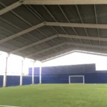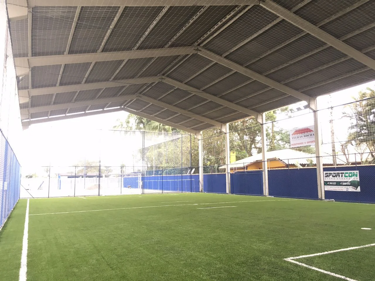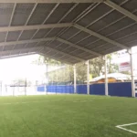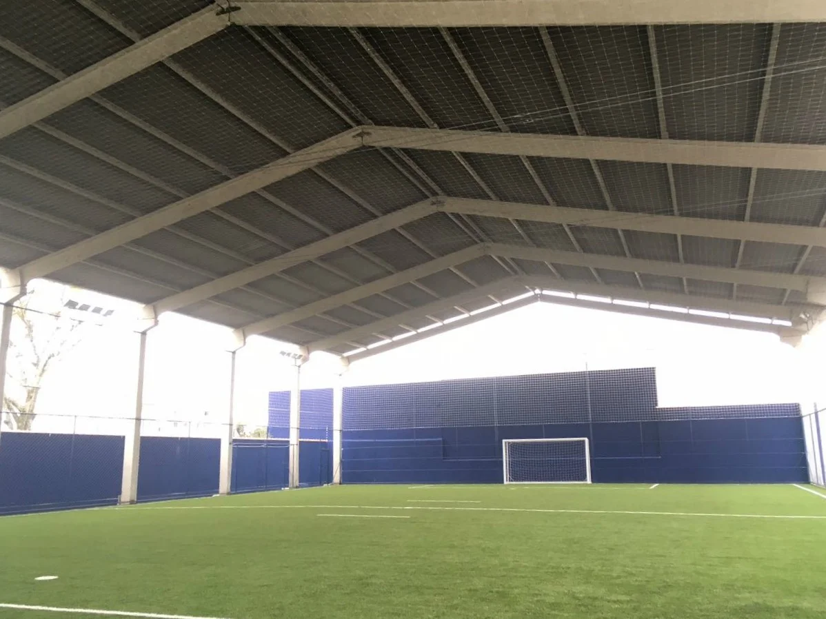 Galpão para cancha de futebol: estrutura 25x40x7m, com beirais e dimensões adequadas para a cancha.