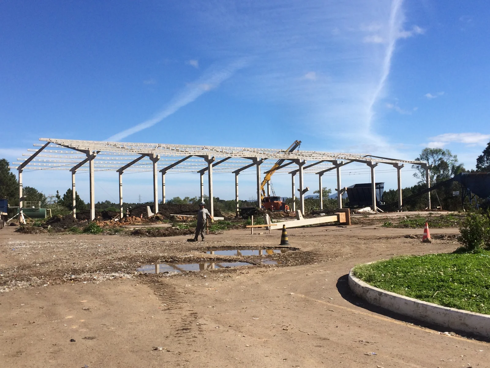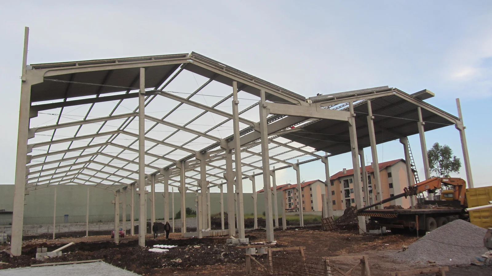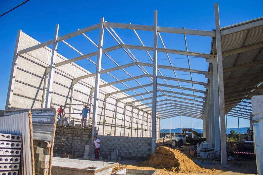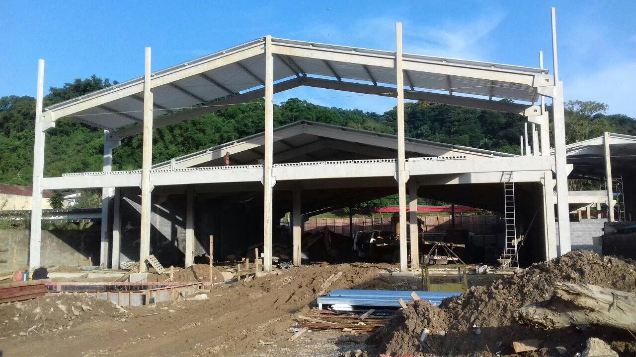 Galpão para mercado (1): estrutura dupla de 39x85x9m, com pilares de oitão para auxiliar no fechamento da obra.