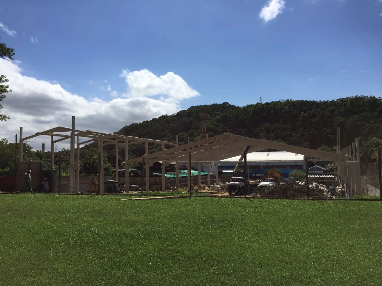 Galpão para igreja: estrutura com vão de 31m mais extensão de 6,5m de largura, com 34m de comprimento e 7m de altura.