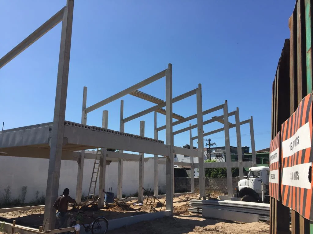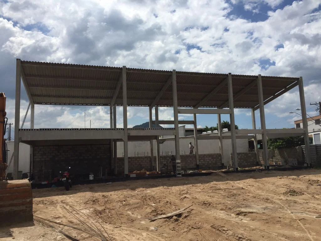 Lojas comerciais: estrutura pré-fabricada 13x20x6,5m. Mezanino parcial, possibilitando pé direito duplo livre parcial; vigas de fachada ao redor da edificação para melhor acabamento de fachada.